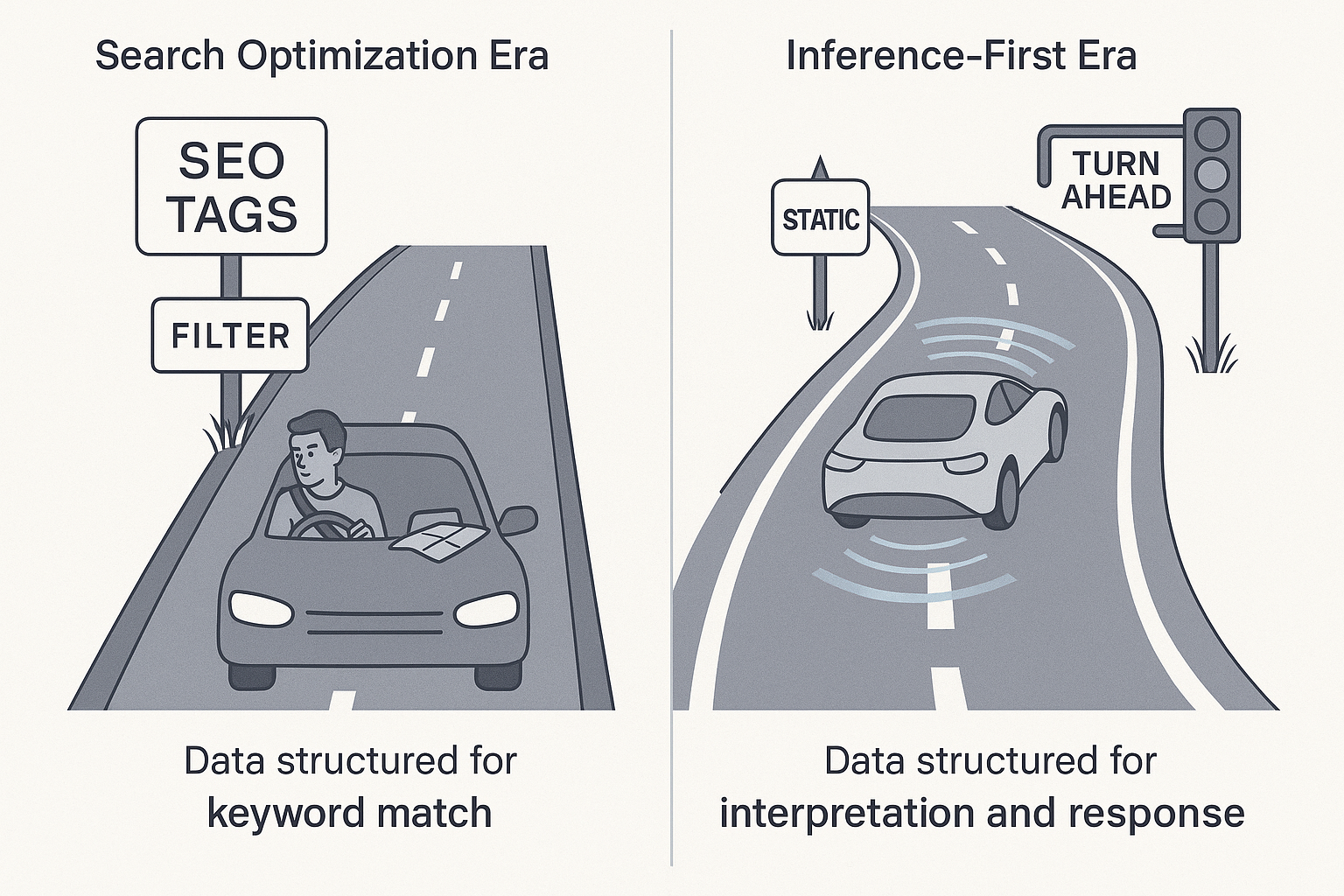 Left Side: "Search Optimization Era"Straight roadStatic signs: SEO tags, filter checkboxesHuman driver with mapData structured for keyword matchRight Side: "Inference-First Era"Complex road with lane markings, signals, and dynamic signageSelf-driving vehicle navigating intentSensors = semantic context, structured relationshipsData structured for interpretation and response